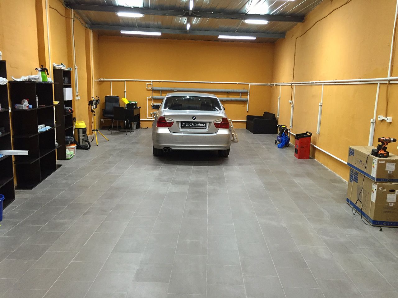 Сначала позаботьтесь об освещении. Выполнять покраску на темную нельзя, так как вы не сможете оценить полученный результат. Желательно, чтобы в гараже были установлены галогенные лампы как на потолке, так и на стенках. Такое расположение позволит осветить каждый сантиметр автомобиля.
