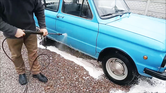 В конце все смываем водой из мойки высокого давления или из садового шланга под обычным напором.