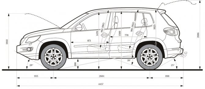 Говоря о предыдущей модели 2013-2014 года, можно сказать что габариты Тигуана в среднем составляли: