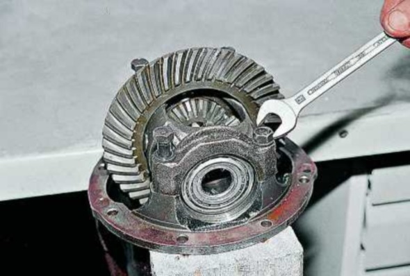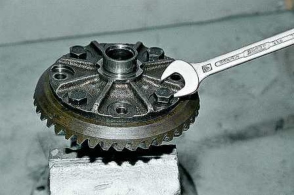 - Дифференциал собран. Напрессуйте на него ведомое зубчатое колесо и головкой «на 17» затяните 10 болтов крепления с моментом 9 кг/см2. Затем осторожно напрессуйте подшипники и собранный узел установите в картер.