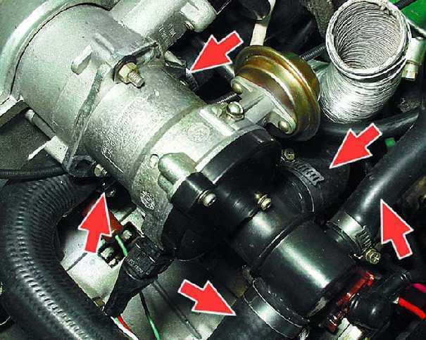 - Отсоединяем шланги от патрубков термостата и снимаем термостат.