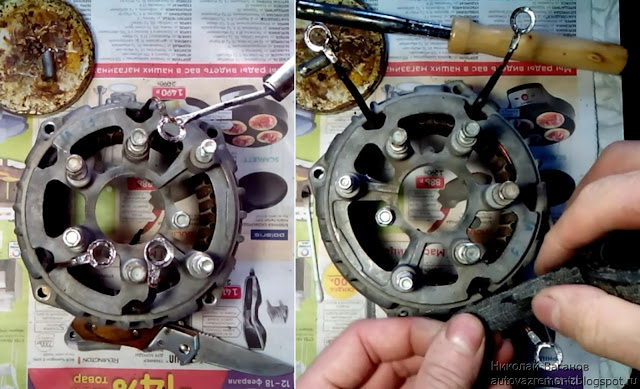 Далее головкой на 8 откручиваем три гайки крепления статора и диодного моста.