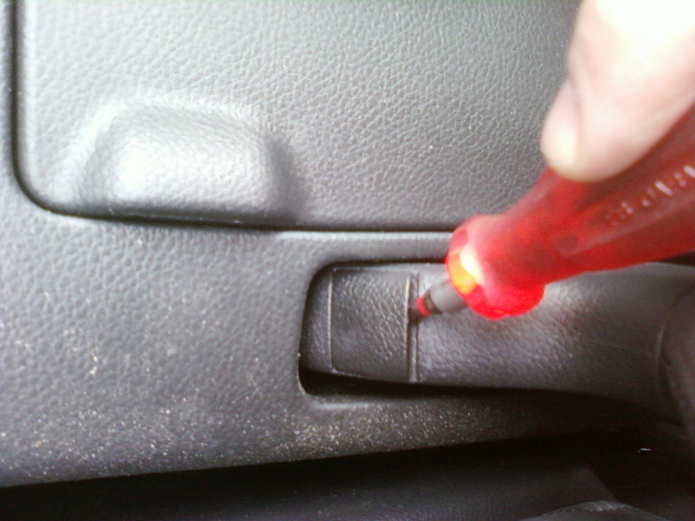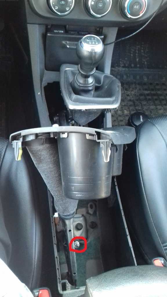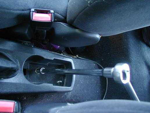 - Тонкой плоской отверткой нажмите на ее угол и, потянув вверх, извлеките. Теперь открылся доступ к самому механизму стояночного тормоза.