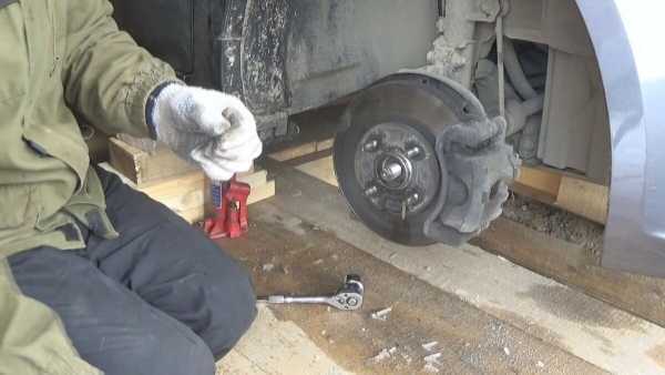 - Отпускают крепежи колеса, диски снимают, нажимают на тормозную педаль (нужен помощник), откручивают гайку ступицы.