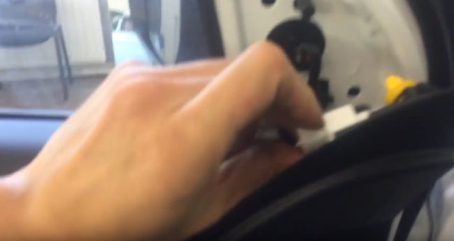 Поддев обшивку снизу пластиковой лопаткой аккуратно выдергиваем клипсы от скелета двери клипсосъемником. Отводим обшивку и нажав на фиксатор отсоединяем штекер идущий к кнопке управления стеклоподъемником.