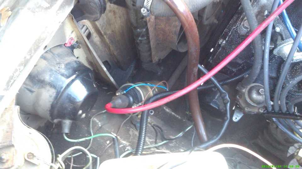 - 4. Установите в прерыватель-распределитель высоковольтный провод с катушки, остальные провода присоедините к катушке. Помимо этого к ней присоединяются провода зеленого и коричневого цвета, которые остались от старого прерывателя. Клемма «Б» — синий с полоской и зеленый, клемма «Л» — сиреневый и коричневый.