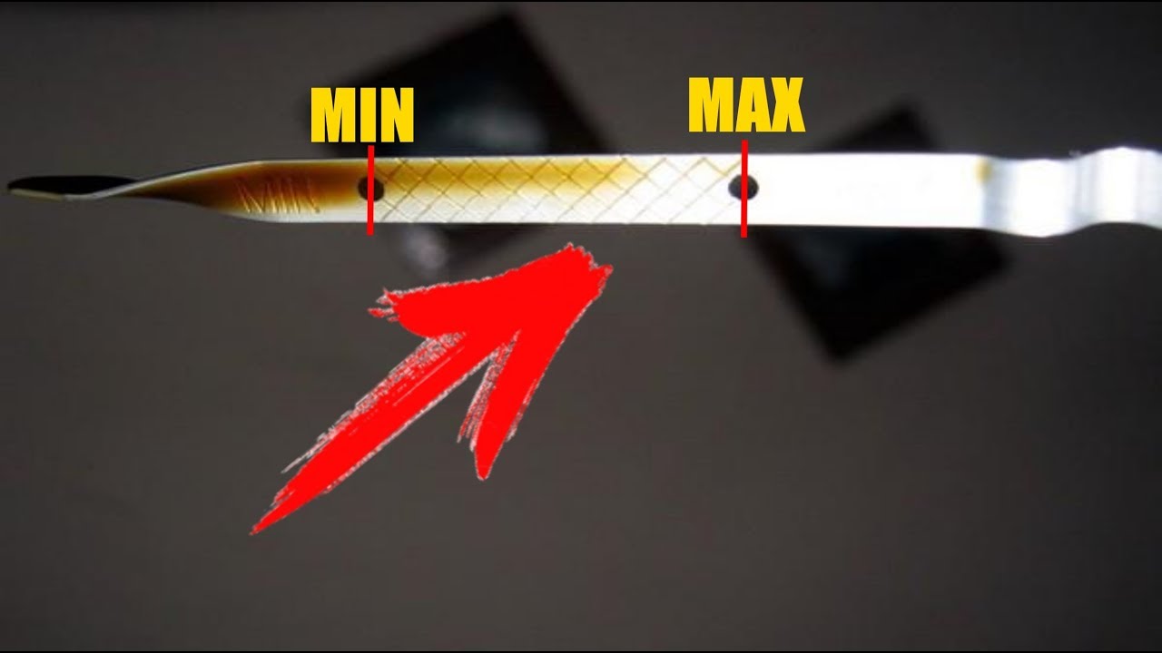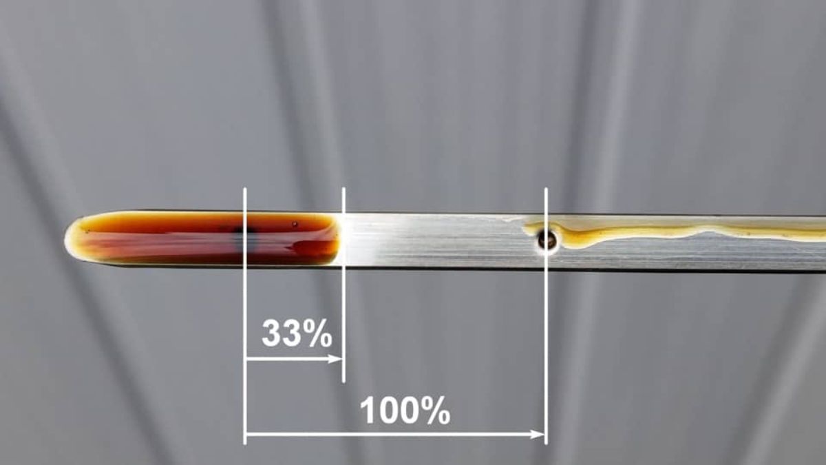 - Снова достают щуп и сморят на отметку, оставленную маслом.