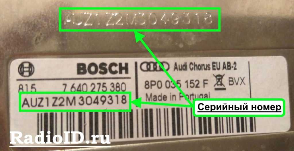 Однако есть и другие, которые мы не перечислили. Независимо от модели и года выпуска все оригинальные радиоприемники Audi маркируются уникальным серийным кодом, который необходимо найти для расчета безопасного кода. Чтобы увидеть этот номер, извлеките аудиоблок из центра консоли и посмотрите на этикетки по бокам или сверху — пример серийного номера: AUZ2Z7B8371102 . Если у вас уже есть идентификатор, введите его в генератор вверху страницы и нажмите кнопку «Рассчитать».