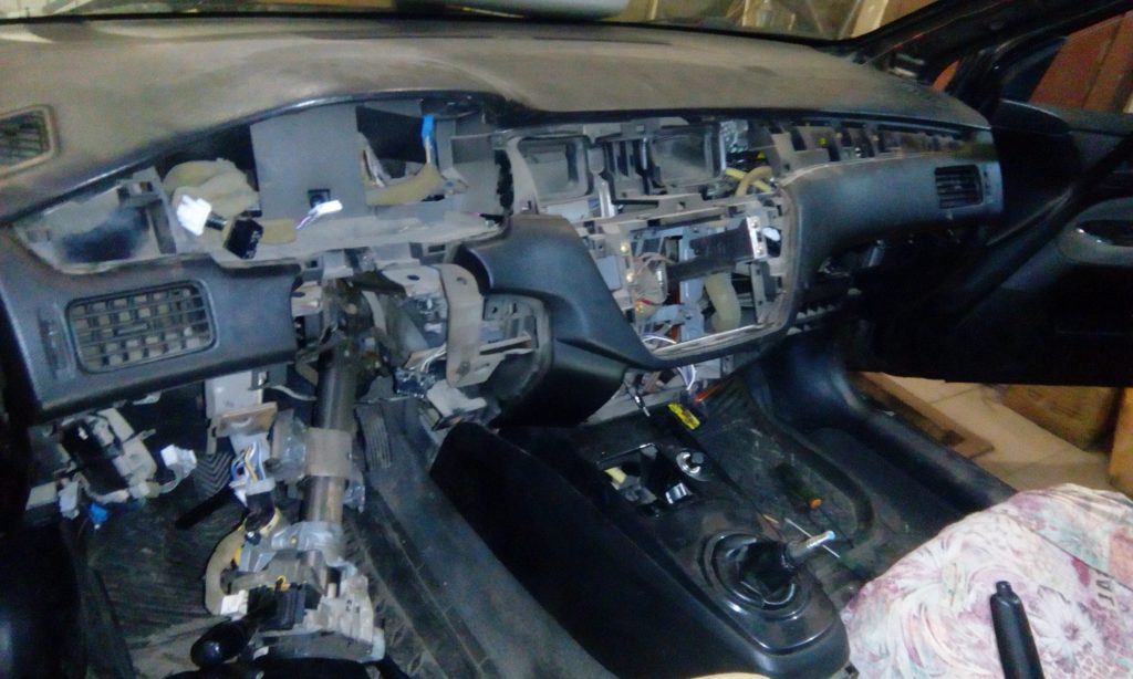Вот вроде всё откручено, теперь снимаем торпедо, руль нужно установить в нижнее положение. Далее немного потянуть на себя, пока торпедо не упрётся в руль и не снимится с пластиковых держателей, которые находятся у лобового стекла