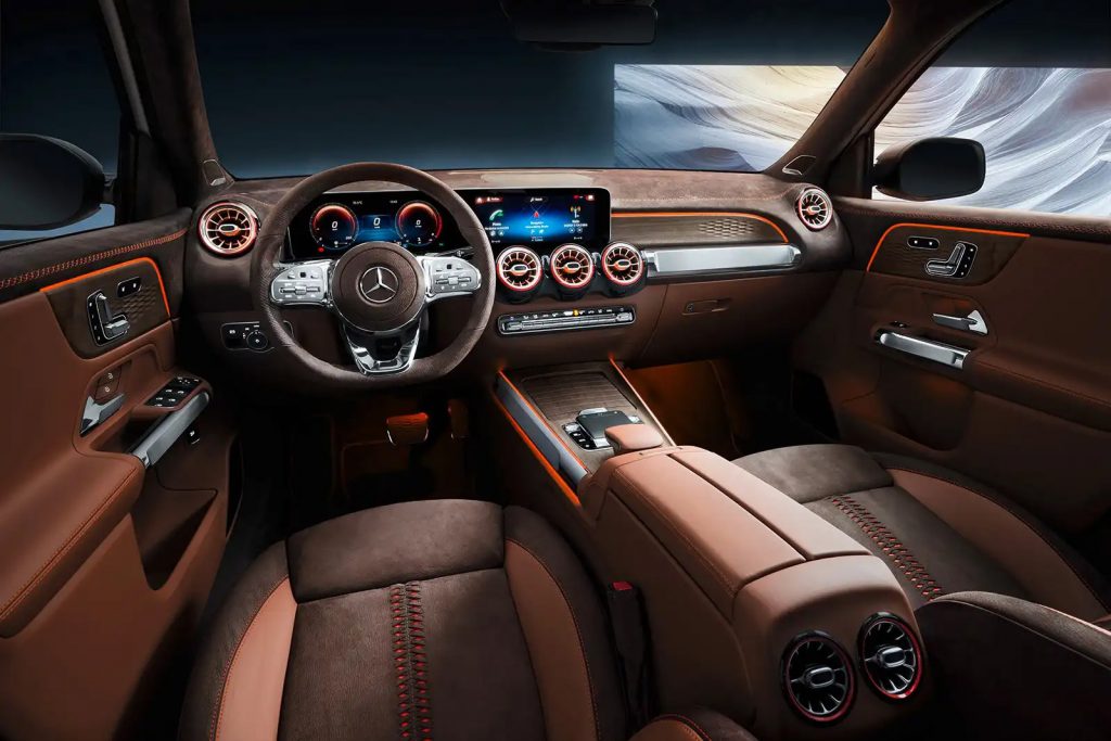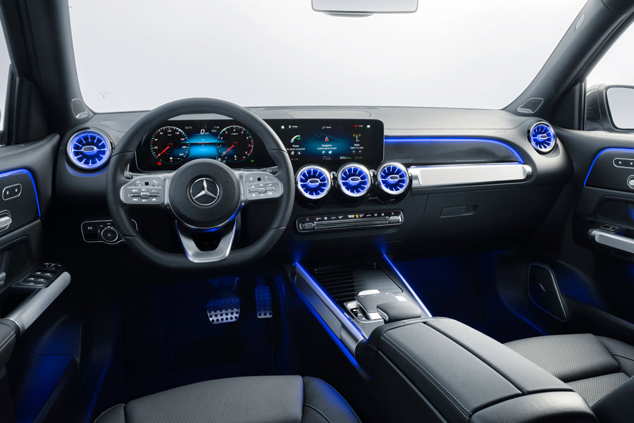Салон компактного внедорожника впечатляет абсолютно новым интерфейсом мультимедийной системы MBUX, виртуальной панелью приборов и вентиляционными дефлекторами в авиационном стиле. Изысканный интерьер нового GLB оборудован амбиентной подсветкой, число оттенков которой насчитывает до 64 вариантов.