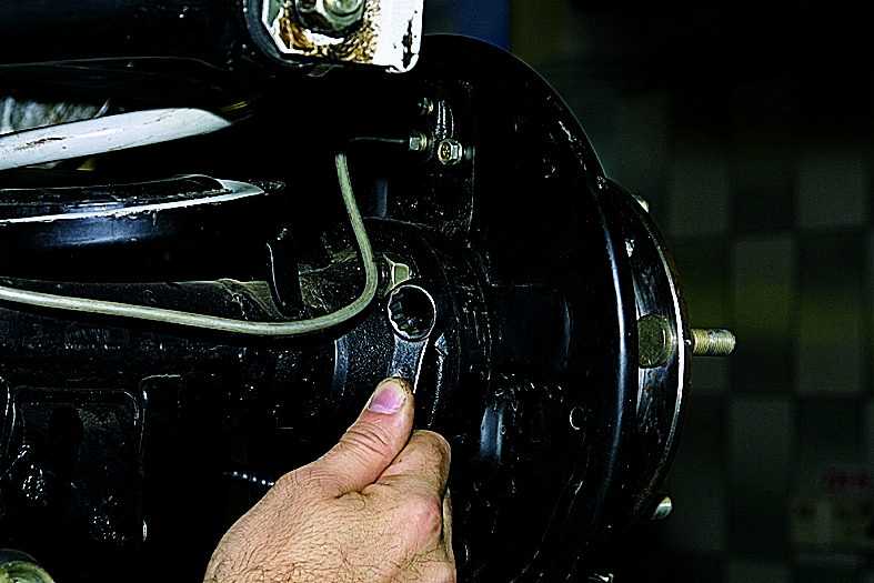 Вставляем два болта в отверстия кожуха тормоза и балки заднего моста, чтобы кожух не болтался на тормозной магистрали