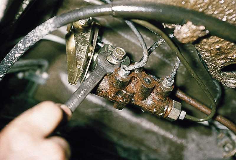 Предварительно требуется очистить от грязи все соединительные шланги и трубопроводы, чтобы убедиться в их герметичности. При очистке нельзя пользоваться острыми предметами. После этого нажать на педаль и застопорить ее. Следует внимательно осмотреть все соединения, чтобы они были сухими, если где-то просачивается жидкость, нужно подтянуть крепления.