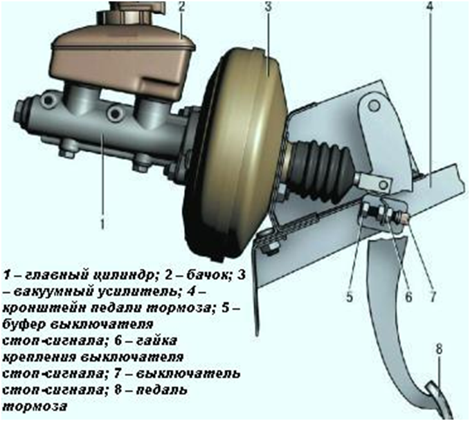 - Открутите болты крепления усилителя и отключите разъём датчика включения тормозов.