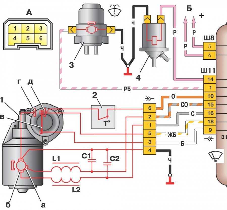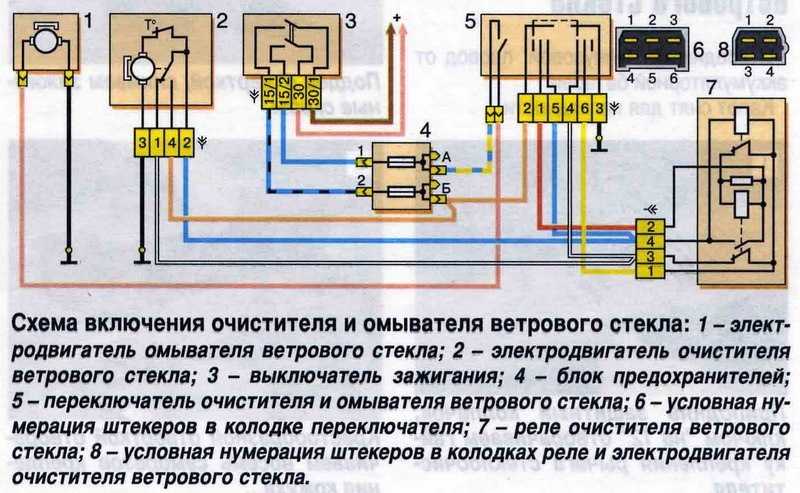 Если питание на выводах переключателя отсутствует, смените переключатель. Отсутствие питания на выводах электродвигателя свидетельствует об обрыве в цепи. При наличие питания на этих проводах проверьте наличие питания между чёрным и жёлточёрным проводом, при отсутствии проверьте крепление чёрного провода к массе. Если схема подключения электродвигателя исправна, а стеклоочиститель не работает, неисправен электродвигатель. Если перегорает предохранитель сразу после установки при включенном зажигании, то короткое замыкание в жёлточёрном проводе, идущем к электродвигателям стеклоочистителя и омывателя. Если перегорает после включения стеклоочистителя то короткое в проводах, идущих от переключателя к электродвигателю или сгорел якорь электродвигателя. Когда стеклоочиститель не работает в прерывистом режиме скорей всего неисправно реле стеклоочистителя. Если в прерывистом режиме щётки останавливаются и двигаются рывками, подгорели контакты в редукторе.