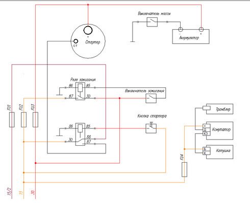 В электрическую цепь последовательно подключена катушка зажигания 16 вместе с дополнительным сопротивлением 14. Оно автоматически замыкается в момент запуска мотора стартером.