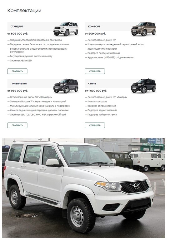 УАЗ Patriot будет продаваться в четырех различных комплектациях. Первая, базовая, помимо скудного списка оборудования, получит старые агрегаты, от предыдущей версии. В остальном, внедорожник может похвастаться неплохим уровнем оснащения.