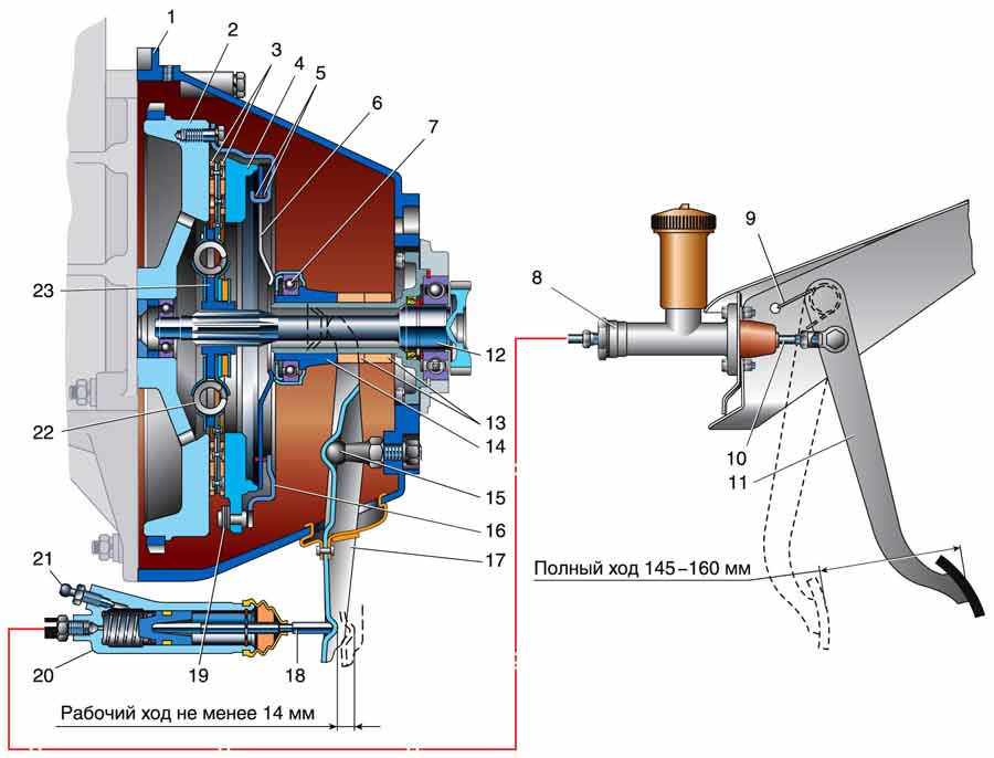 - он должен иметь механизмы автоматической компенсации износа сцепления, т.е. усилие на педали должно иметь одинаковую характеристику даже при уменьшении ширины фрикционного диска