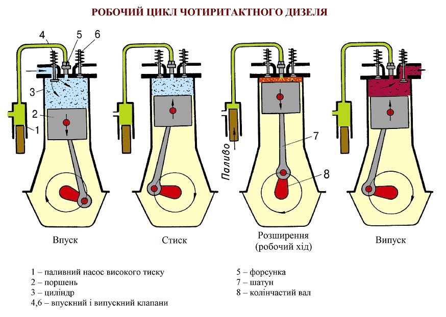 В дизеле можно использовать двух- или четырехтактный цикл. На первом этапе поршень осуществляет движение вниз и втягивает воздух через впускной открытый клапан. На втором — движение этой детали осуществляется вверх, и происходит сжатие воздуха в цилиндре. Степень сжатия колеблется в границах 14:1–24:1, воздух нагревается до температуры 800 °C. В конце этого такта форсунка выпрыскивает топливо в горячий воздух под давлением 1500 кгс/см².