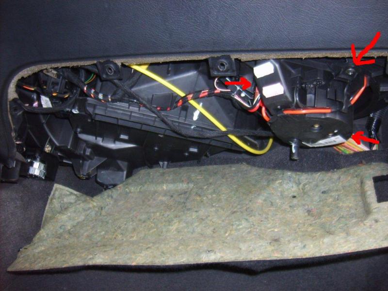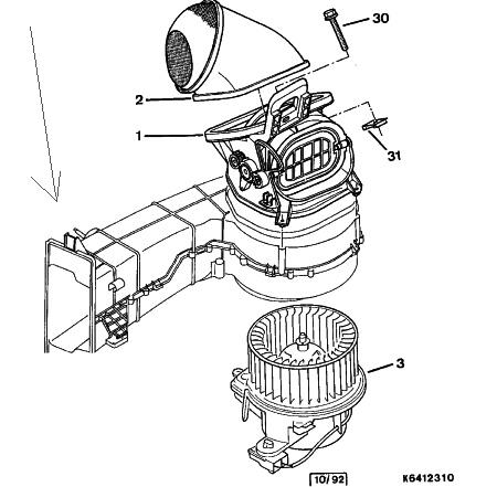 Если вещевой ящик открыт или снят, то становится доступным двигатель вентилятора (4). Он вставлен снизу в воздуховод (1). Резисторы и термовыключатель (3) на иллюстрации сняты вместе со штекером (2). При установке следить за тем, чтобы блок сопротивлений не нарушал герметичности воздуховода. При необходимости применить герметик. |