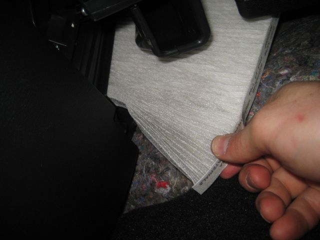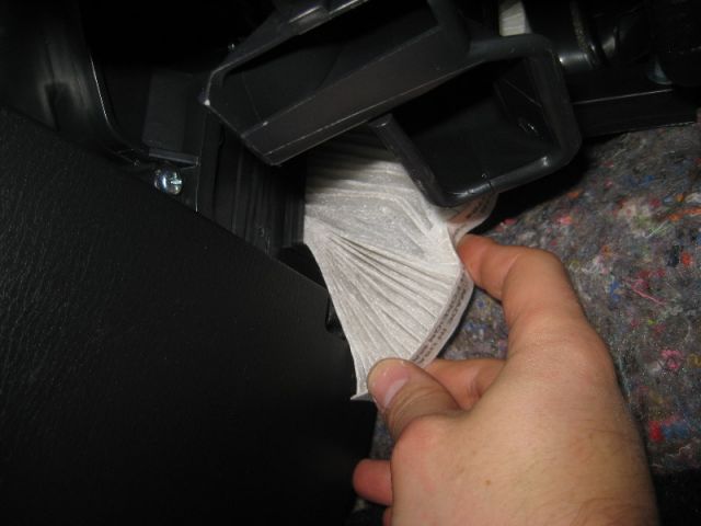 Заглянув под бардачок, слева можно увидеть крышку салонного фильтра. Следует нажать на фиксатор и снять крышку. Затем ухватить нижний край фильтра и вытащить.
