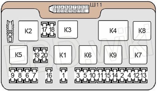 Схема, нарисованная на крыше блока, показывает: какой предохранитель, отвечает за то, или иное реле. Все реле на данной схеме, помечаются буквой «К», а цифра, которая идет в паре с буквой, показывает на прибор, за который ответственное это же реле.