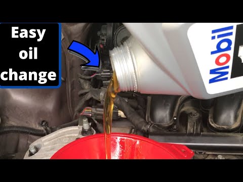 Открываем капот, отворачиваем заливную крышку, ставим в нее воронку. Кстати, ее можно сделать из обычной пластиковой бутылки, как это сделали мы. И заливаем полностью 4 литра масла.