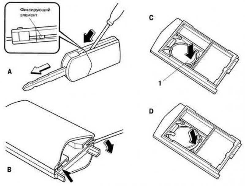 Замена батарейки в карте “Advanced Key”Внимание. Фиксаторы и защёлки, как и корпус пульта, выполнены из пластика. При низких температурах пластик становится хрупким. Во избежание поломки фиксаторов, пульт следует согреть.