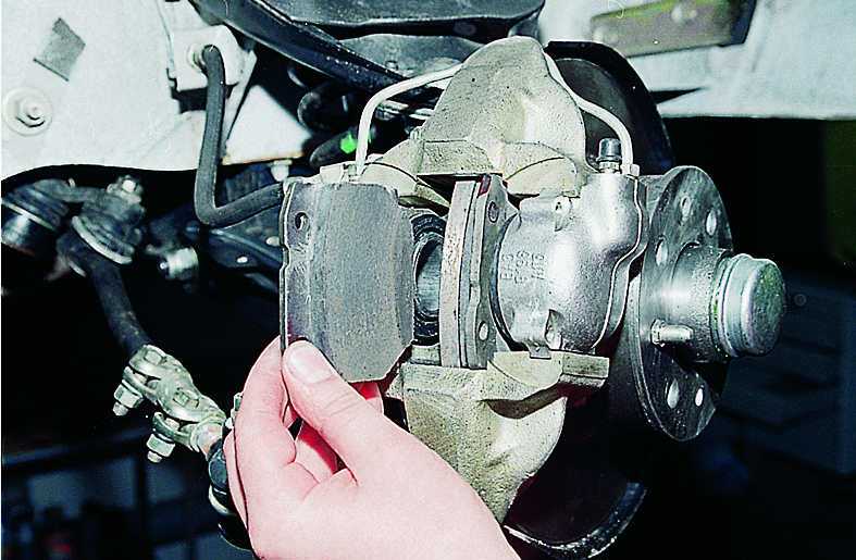 Замена начинается непосредственно со снятия старого механизма. Для этого необходимо поддомкратить переднюю часть автомобиля, затем отвинтить и снять колесо, и снять тормозной суппорт.