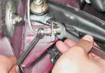 Для этого разрезной ключ на «10» надеваем на гайку крепления тормозной трубки. При необходимости можно слегка постучать по нему молотком, чтобы он надежнее зафиксировался на гранях гайки. Зажимаем этот ключ винтом, тем самым его стенки плотно обжимают гайку, срываем ее. Только таким способом вы не «слижете» грани этой гайки.