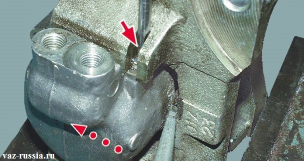 - Суппорт следует разместить в тисках, но при этом важно зажимать его не сильно. Если его пережать, то часть детали может попросту отколоться, в результате не избежать замены суппорта.