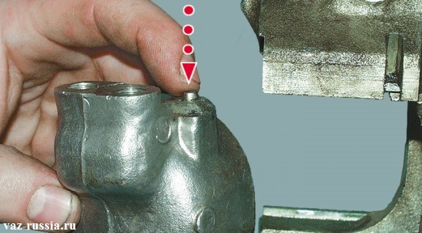 - После этого необходимо на боковой части разыскать паз, в котором расположен пружинный фиксирующий элемент. Чтобы извлечь тормозной цилиндр, потребуется нажать на этот фиксатор отверткой. На фото ниже показано расположение паза красной стрелкой.