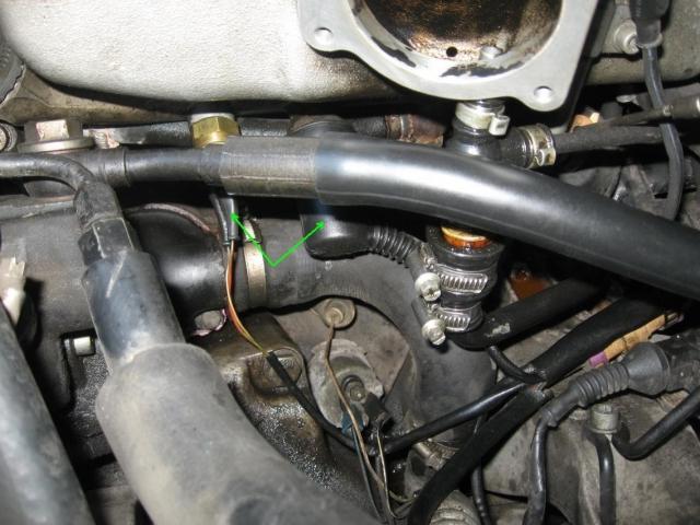 Ослабляем хомуты и снимаем шланг с корпуса термостата (можно не снимать шланг, только отсоединить от корпуса термостата, но мне надо было подлезть дальше), при этом выльется антифриз, если не был слит заранее.