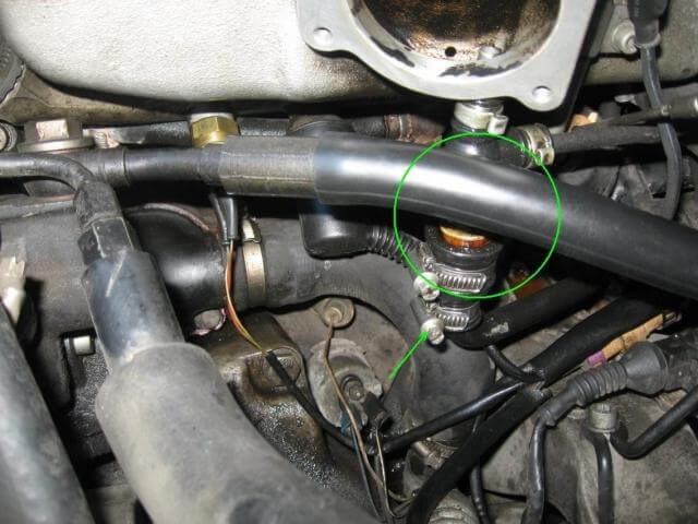 Снятие термостата в пути проблематично. Он расположен довольно глубоко внизу, так что придется слить почти всю охлаждающую жидкость. Кроме того, при горячем двигателе пройдет довольно много времени, прежде чем вы сможете начать работу без опасности обжечь себе руки. При установке нового термостата необходимо заменить уплотнительное кольцо на корпусе термостата или на корпусе водяного насоса.