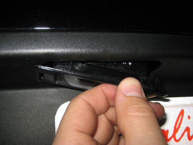 Вставить отвёртку в специальный паз плафона и начать аккуратно сдвигать его вправо для правого фонаря и влево для левого соответственно. Одновременно с этим начать смещение немного вниз, чтобы увеличить зазор между корпусом машины и плафоном.- Подцепить его пальцами и вытащить.