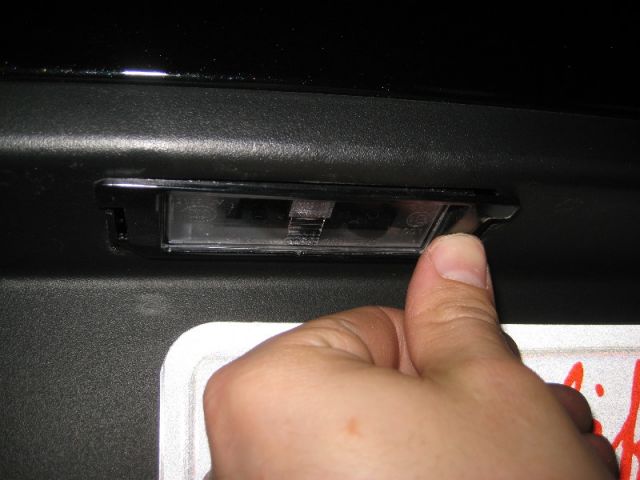 Сначала надо нажать на фиксатор корпуса лампы сбоку и вытащить корпус из крышки багажника. Затем повернуть лампу на четверть оборота против часовой стрелки, чтобы извлечь ее из корпуса. После этого можно просто вытащить старую лампу из патрона и установить туда новую.
