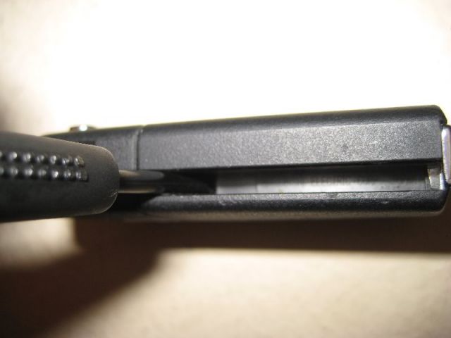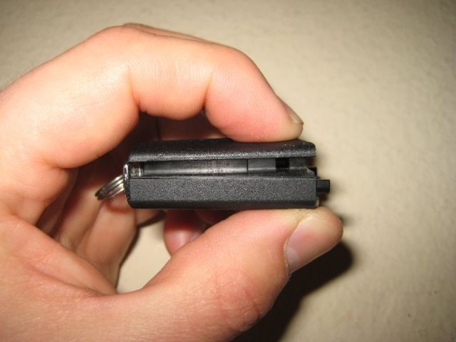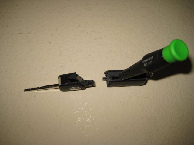 1. Первым делом нажмите на кнопку, чтобы ключ раскрылся. Возьмите отвертку и нажмите в углубление, где соединяются две части ключа. Присмотритесь внимательно и вы увидите внутри ключа что-то вроде кнопки темного цвета. После нажатия ключ разберется на две части.