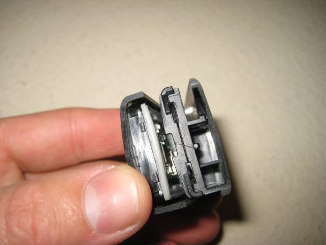 При нажатии одна половина – крышка – отделится от другой. Когда крышка отделится, будут видны внутренности ключа. Там же можно увидеть батарейку и ряд других устройств.