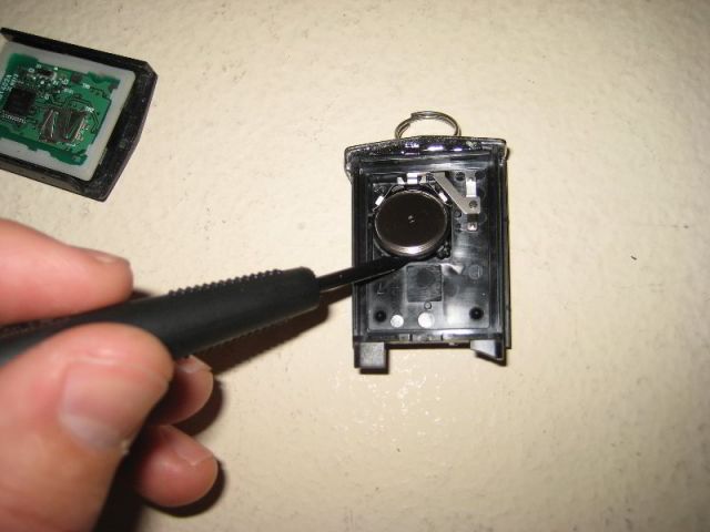 Вставьте плоскую отвертку в отверстие в брелке как на фото (нажимая вы ослабляете фиксатор двух частей корпуса)