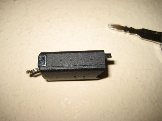 Нажмите внутри брелка кнопку блокиратор, который держит часть брелка с металлическим ключом