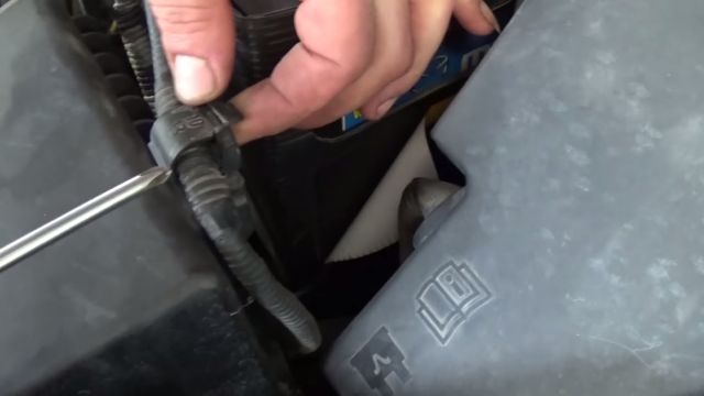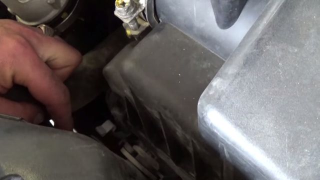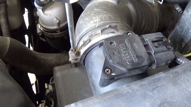 - чтобы снять крышку, необходимо отсоединить штекер от датчика ДМРВ. Дополнительно можно ослабить хомут резиновой гофры;