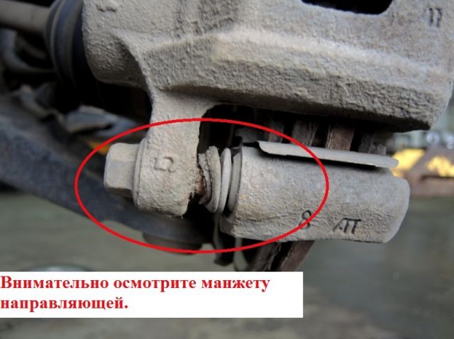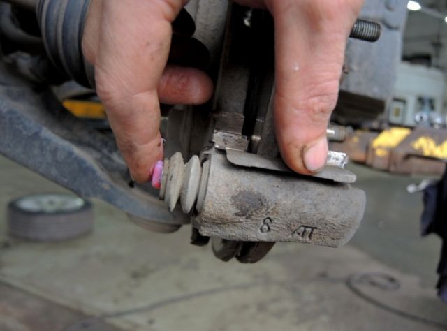 Поднимаем тормозную скобу вверх и внимательно осматриваем тормозные суппорты Мицубиси Outlander XL. Здесь манжеты целы.