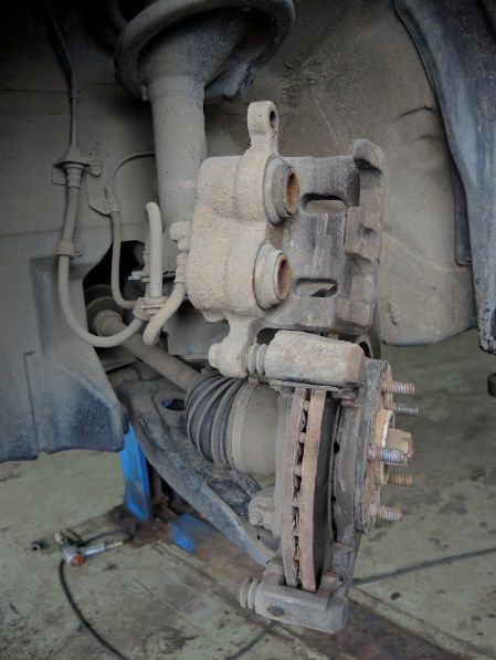 Далее преподымаем тормозную скобу, осматриваем суппорт. Всё гуд.