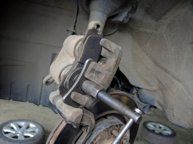 Снимаем старые колодки и с помощью инструмента зажимаем суппорты вовнутрь.