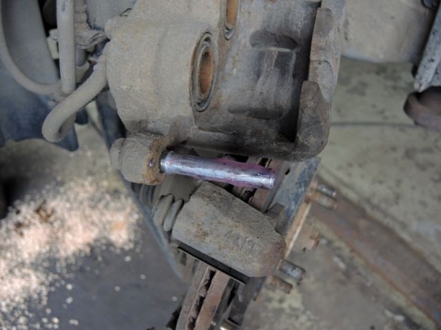 Смазываем канал нижней направляющей и так же смазываем нижний тормозной «палец» устанавливаем его на место и затягиваем.