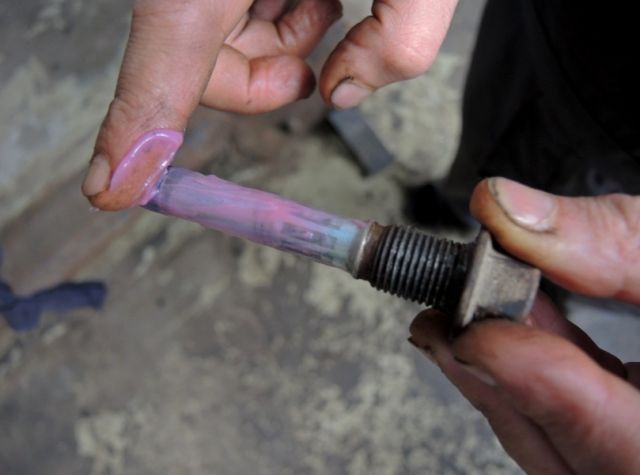 - Невозможно выкрутить болты крепления колодок. Причин тому может оказаться две: крепежные детали либо прикисли (проще говоря, намертво склеились с самими колодками из-за коррозии), либо еще того хуже – приварились к ним. Первое возникает тогда, когда машиной долгое время не пользуются. И если детали двигателя от воздействия влаги защищает масло, а кузов – антикоррозийное покрытие, то колодки со всеми своими компонентами, равно как тормозные диски и барабаны, перед ржавчиной беззащитны. В этом случае, чтобы снять требующие замены детали, придется воспользоваться специальной жидкостью, разъедающей ржавчину. А вот если гайки крепления из-за сильного нагрева колодок в процессе их работы приварились к ним, остается лишь одно: аккуратно, стараясь не повредить диски, срезать гайки болгаркой.