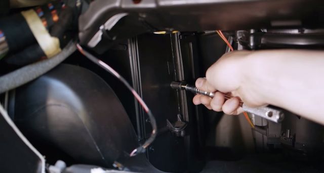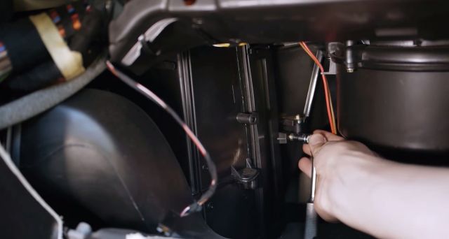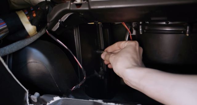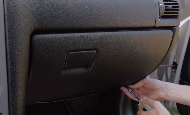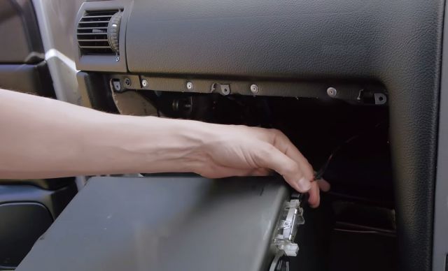 Чтобы было удобней, сначала стоит отодвинуть пассажирское сиденье назад до упора. Затем нужно открыть бардачок и открутить три винта вверху и три винта под бардачком. Далее снять бардачок и отсоединить штекер проводов.