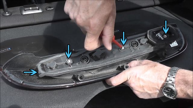 Затем открутить 4 винта крепления задней крышки фары и снять крышку. Все лампочки установлены прямо в крышку и поменять их не составит труда. Заменив лампы, следует произвести установка в зеркальном порядке.