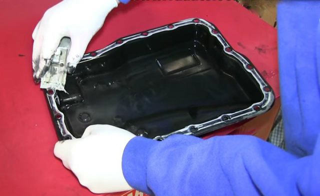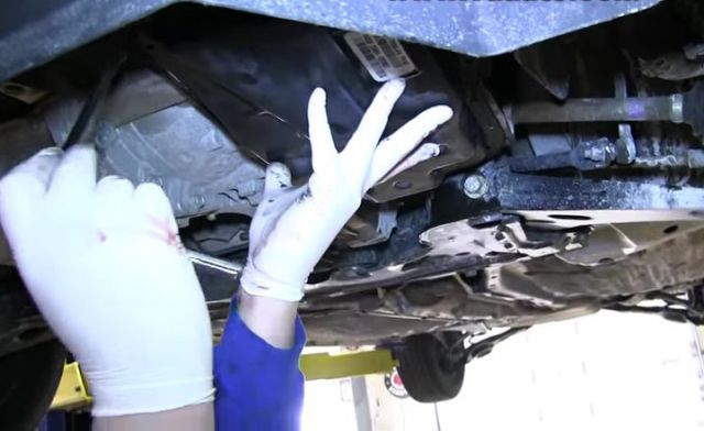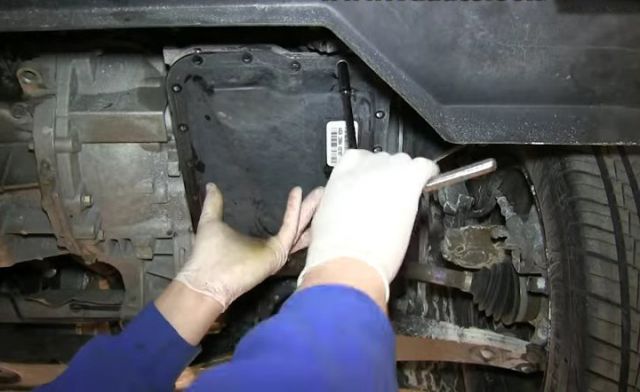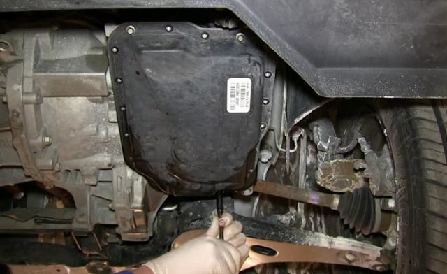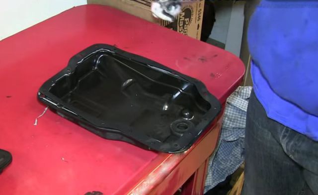 5Лишь после того, как жидкость будет слита, необходимо открутить и демонтировать поддон с коробки передач.