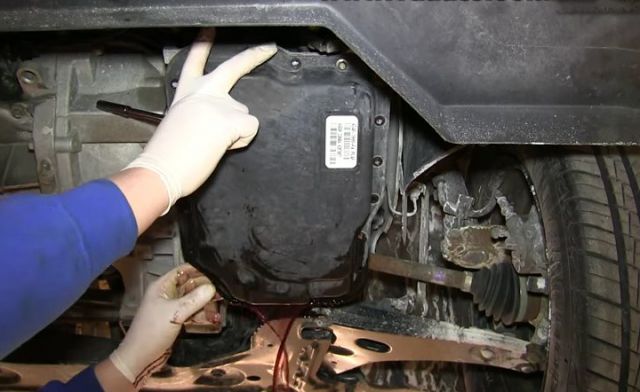 - После снятия поддона сразу подставить емкость для слива старой жидкости