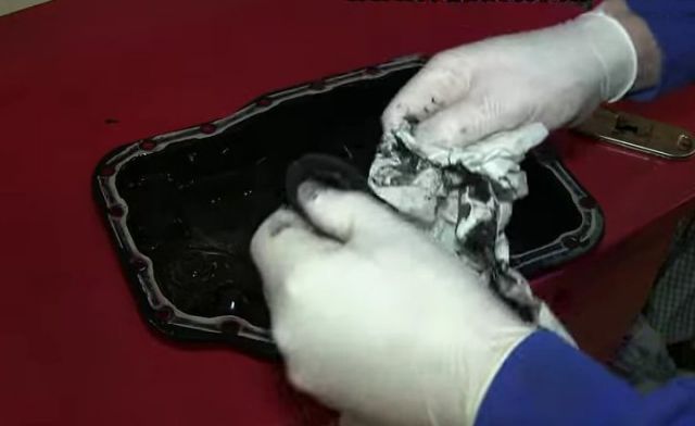 Аккуратно сливаем оставшееся в поддоне масло, протираем магнит от грязи и металлической пыли.